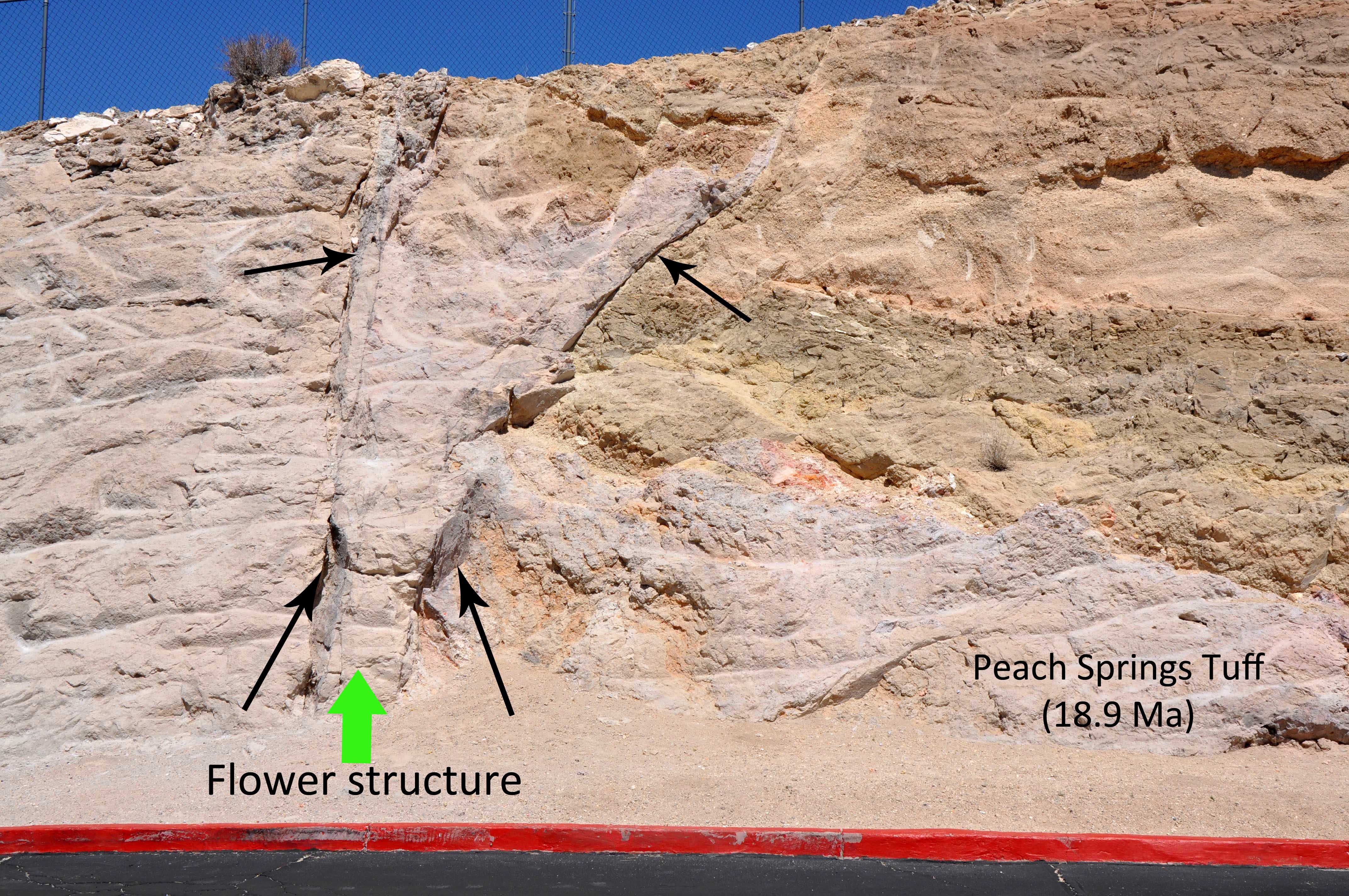 Flower structures occur when strike-slip faults occur in converging crust. The rocks are faulted upward and in cross section resemble the petals of a flower. This flower structure formed in the Miocene Peach Spring Tuff of western Arizona.