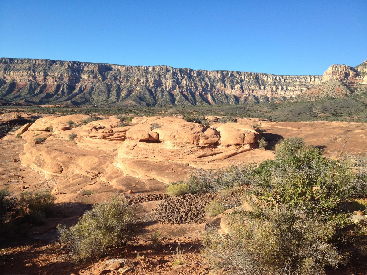 Exposure of a cross-bedded sandstone of the Esplanade Formation, north of Deer Creek Trail on the north side of the Colorado River. In the foreground, a crust of cryptobiotic soil provides a living ground cover in the high deserts of the Southwest. The soil, consisting of cyanobacteria, lichens, and mosses, forms crusts that are resistant to wind and water erosion and provide nutrients to plant life. These photos were taken at about the 5400’ elevation on the Esplanade of the Grand Canyon.