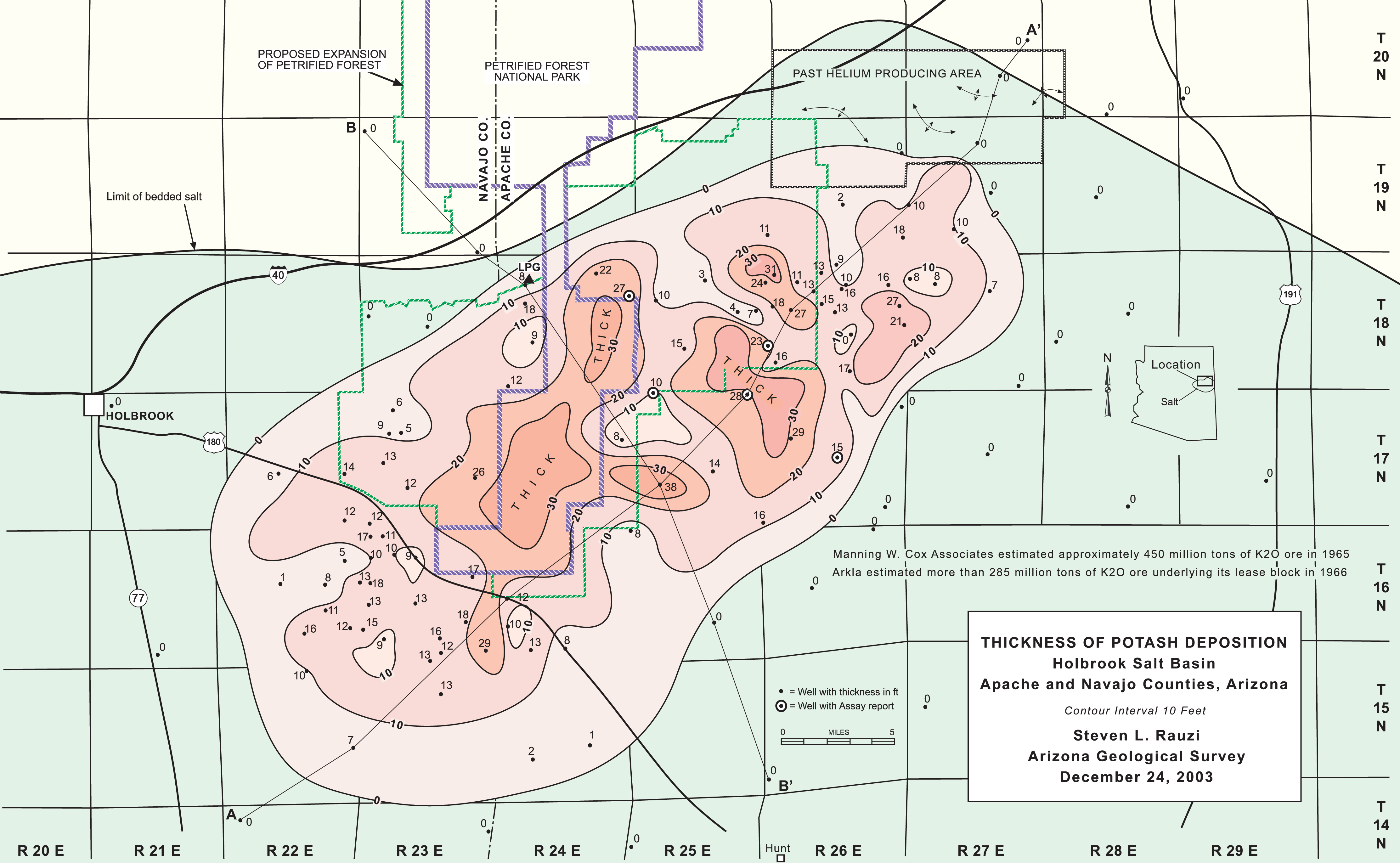 This map shows the thickness in feet of potash of the Supai Formation. Potash is an essential ingredient of fertilizer. For Steve Rauzi's 2008 report on potash of the Supai Formation of the Holbrook Basin: http://repository.azgs.az.gov/uri_gin/azgs/dlio/1001
